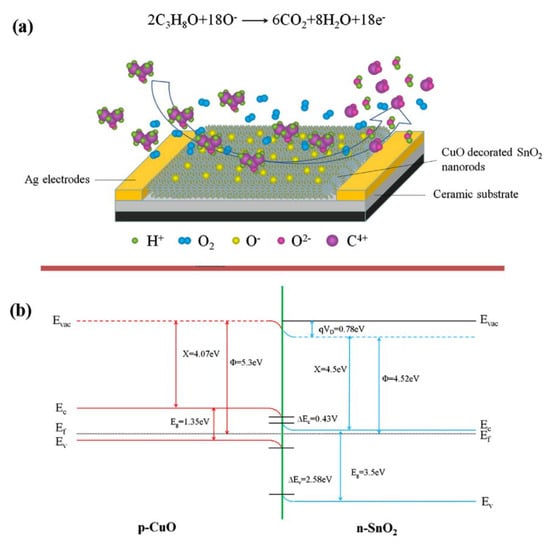 (a) Schematic view of the possible sensing mechanism of sensors based on CuO-decorated SnO2 NRs and (b) the proposed energy band structure diagram of the p-CuO/n-SnO2 heterojunction. Reprinted with permission from [47]. Copyright 2018 Elsevier.