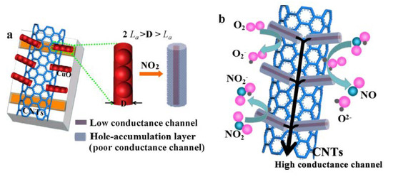 Metal oxides are used to detect oxidizing and reducing gases in a simple and cost-effective manner. Their chemiresistive variation emanates from the oxidative or reductive interaction of the target gas with the metal oxide surface and the consequent change in the charge carrier concentration [3]. The nanoforms of gas-sensitive layers possess a large specific surface, abundant mesopores, and many oxygen defects/vacancies and chemisorbed oxygen, which could adsorb target gases. The gas-sensing properties are strongly related to the gas-sensing layer composition, e.g., the CuO nanoparticles connected with In2O3 nanoparticles [49]; forming many junctions, such as CuO-In2O3 (heterojunctions), In2O3-In2O3, and CuO-CuO (homojunctions), resulting in enhanced NH3 detection. Another example is the CuO-based nanocomposite prepared with CNTs (carbon nanotubes) and CuO nanorods. As was mentioned earlier (Section 3.1), such gas sensors exhibit an excellent gas sensing performance, i.e., the lowest detectable limit of 970 ppb of NO2 at room temperature [69]. The electronic transmission ability of CNTs is superior to that of CuO. Therefore, CNTs behaved as a highly conductive channel and CuO as a lowly conductive channel. Furthermore, due to the lack of electrons, the hole-accumulation layer served as a poor conductance channel. The high conductance channel of CNTs, combined with many low conductance channels of the CuO NRs, established the channels of electron transmission. Therefore, the resistance of 1D CuO-CNTs is largely dependent on the resistance of CuO nanorods (Figure 7a). When it was exposed to air, oxygen molecules adsorbed on the surface of the sample tended to trap the electrons from the CuO conduction band and generated O2− adsorbates. In the case of NO2 gas, the gas molecules could attract electrons from the gas-sensitive material because of the high electron affinity to NO2 molecules. Both processes could result in a decrease of electron density, an increase of the hole’s density on the surface of the semiconductor, and a rapid decrease of the resistance of the sensor (Figure 7b) [69].