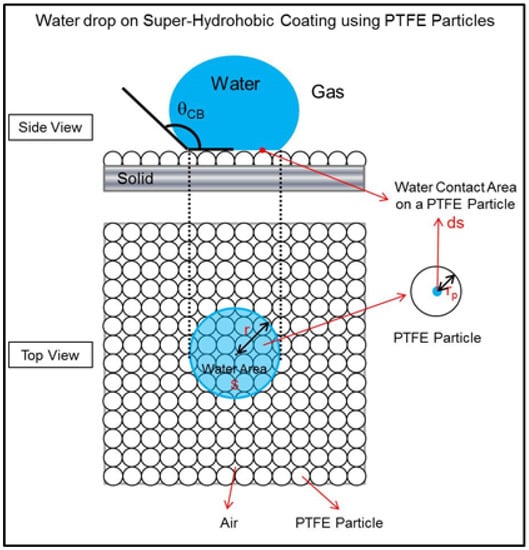 Figure 2 schematically describes the theoretical wetted area for a water droplet on a PTFE surface under the Cassie-Baxter wetting condition. The water contact ratio is shown in Equations (1) and (2), where is the contact ratio, n is the number of contact areas between a PTFE particle and fluid droplet, ds is the contact area between the droplet and the PTFE particle, and is the PTFE particle radius.