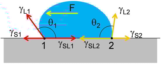 If a water droplet is assumed to have infinitesimal thickness dw, it can be modeled as a two- dimensional droplet contacting a superhydrophobic surface (Figure 3). The surface tension of the coating surface, , the surface tension from the supercooled water droplet, , and interfacial tension, , are acting on the surface. All other external forces acting on the droplet can be included in net force, F. The contact angle, can be found by setting the net force acting on the droplet equal to 0. At the boundary points 1 and 2, where the gas, liquid, and solid phases exist, Equation (3) can be derived [].
