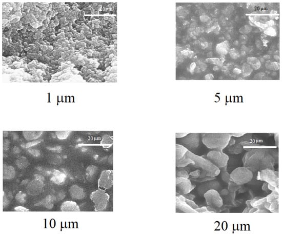 Four different coatings were tested with PTFE particle diameters of 1, 5, 10, and 20 μm. These particle diameter sizes were provided by the manufacturer. The particles were also run through a fine mesh to ensure better uniformity in particle size. Scanning electron microscope images of these coatings are shown in Figure 5. Each coating was created by mixing the PTFE particles with a methyl silicone oligomer hardener and hydrofluoroether, a fluorinated solvent, and then applied to a 5 mm × 5 mm aluminum plate via an air paint spray gun.