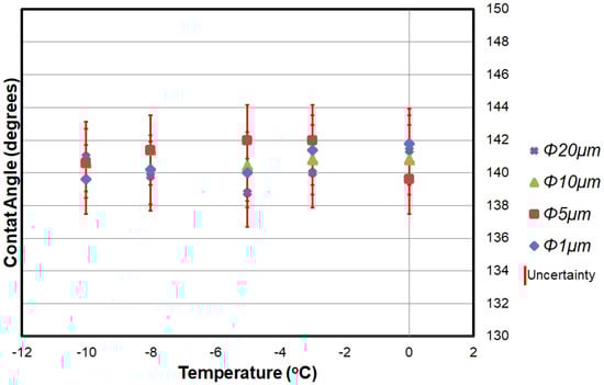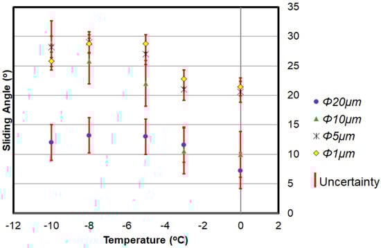 Figure 8 shows the sliding angle, , related to temperature for the various coatings tested. Temperature did have an impact on the results, with a decrease in temperature generally leading to an increase in the sliding angle. However, the coatings with larger particle sizes (10 and 20 μm) had much smaller sliding angles. The greatest decrease in sliding angle came between the 10 and 20 μm where the average contact angle decreased by a factor of a least 1.71, with a decrease of up to 2.4 at lower temperatures.