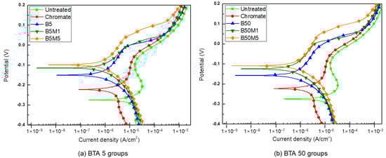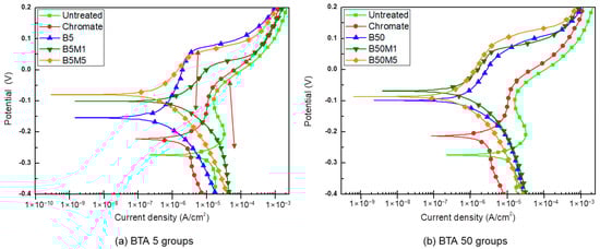 Potentiodynamic polarization curves of surface treatment immersed for 5 s in (a) 5 mM and (b) 50 mM 1,2,3-benzotriazole (BTA) combined with sodium molybdate (Na2MoO4)