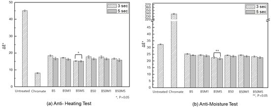 Figure 3a shows the color difference ΔE* measured after samples underwent the wet condition discoloration test. The chromate group exhibited excellent moisture resistance and has the lowest color difference ΔE*. Color difference tended to decrease with increasing deposition time and the addition of Na2MoO4. An improvement in moisture resistance was not observed with increasing BTA addition. Although electrochemical corrosion resistance in the Na2MoO4 + BTA treated groups was higher than in the chromate group, humidity resistance was lower.