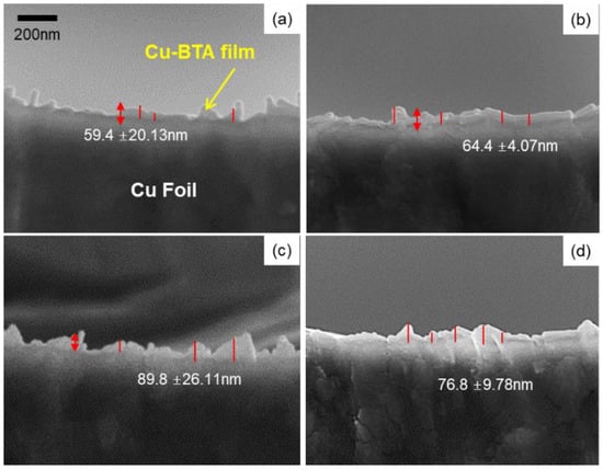 Morphology analysis based on cross-sections observed by FE-SEM (Figure 5) showed that films prepared by adding Na2MoO4 were more densely attached to the Cu substrate and a uniform considering the standard deviation of the thickness data. This was because Na2MoO4 accelerated the formation of Cu-BTA, even at relatively low concentrations (1 mM of Na2MoO4).