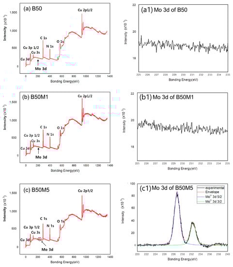 X-ray photoelectron spectroscopy (XPS) patterns of the (a) B50, (b) B50M1 and (c) B50M5 groups immersed for 5 s and XPS spectra of Mo 3d (same sample as survey) from each group.