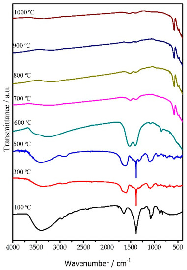 Fourier transform infrared spectroscopy (FT-IR) of the Lu2O3:Eu3+, Bi3+ (PVP/Lu = 5.0) powder heat treatment at different temperatures.