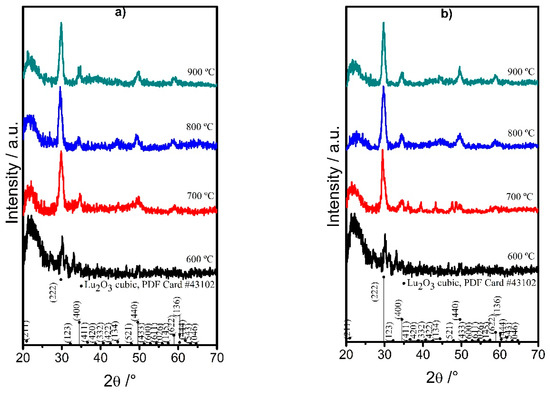 Figure 2a,b illustrates the X-ray diffraction patterns of the Lu2O3:Eu3+, Bi3+/PVP modified thin films, for molar ratio PVP/Lu = 1 and 5, respectively, as a function of the annealing temperature. It was important to analyze these concentrations as they are the minimum and maximum molar ratio of PVP/Lu values incorporated into sol Lu2O3:Eu3+, Bi3+. As observed, the crystallization process starts when the xerogel is calcined at 600 °C, and well-defined diffraction peaks appear from 700 °C, which can be indexed to cubic Lu2O3 structure (JCDPS card# 431021) with a spatial group Iā3 (lattice parameter 10.391 Å), and confirms the FT-IR results showed previously. As the temperature increases, the diffraction peaks become slightly sharper and more resolved, and no new crystalline phase appears, none-from the presence of Eu3+ and Bi3+ ions, or for the PVP content.