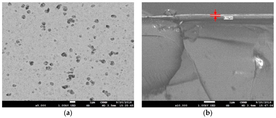 (a) Scanning Electronic Microscopy (SEM) micrograph of Lu2O3:Eu3+, Bi3+ thin films, PVP/Lu = 5.0, annealed at 700 °C; (b) SEM micrograph showing the thickness of the film. The lower cracks in the image correspond to the SiO2 substrate.