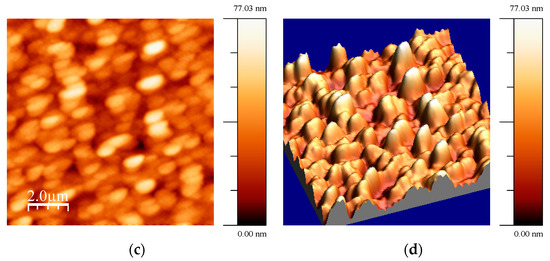 AFM micrographs of (a) PVP/Lu = 1.0, (b) 3D view; (c) PVP/Lu = 5.0 thin films, and (d) 3D view.