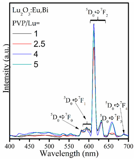It is worth noting that in the region between 400 and 600 nm, with a maximum at 550 nm a short bluish emission of Bi3+ ions, from the 3P1 → 1S0 transition is weakly observed. This band overlaps with the typical excitation bands 7F0 → 5L6 (395 nm) and 7F0 → 5D2 (466 nm) of Eu3+ f-f interactions and, therefore, the dismissed emission of Bi3+ is corresponding with an effective enhancement of the Eu3+ emission and can be observed for all the PVP/Lu ratio due to an energy transfer process from Bi3+ to Eu3+, as mentioned previously [48,49], in Figure 7.