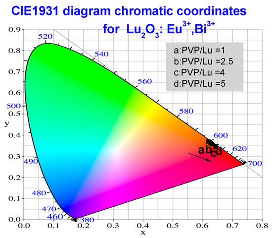 The band at 610 nm is attributed to Eu3+ electric dipole transition 5D0 → 7F2, as observed in Table 1, and the ratio R (called as the asymmetry ratio gives a measure of the degree of distortion from the inversion symmetry of the local environment of the Eu3+ ion in matrix) [44] between the intensities I(5D0 → 7F2)/I(5D0 → 7F1) [45] was enhanced when the incorporation of PVP was increased. This is due to the enhancement of 5D0 →7F2 which is for the magnetic dipole transition 5D0 →7F1 is not sensitive to the changes in the neighborhood of the Eu3+ ion while the electric dipole transition 5D0 → 7F2 is very sensitive to any structural change [46]. When the molar ratio of PVP/Lu increases, the intensity of 5D0 → 7F2 transition also increases and reaches the maximum when the PVP/Lu = 4.0. Subsequently, the red luminescent intensity decreases inversely due to PVP concentration quenching, confirming that the incorporation of PVP changes the structure as shown in Figure 6 and Table 2, where the red color purity was increased. Additionally, the transition 5D0 → 7F3 at 657 nm, which is a forbidden transition, was observed for highly molar ratio of PVP. This means that the crystal field is very sensitive to the surrounding ligands and, as a result, the parity selection rules were broken [47].