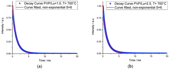 Figure 9 shows decay curves for 5D0 → 7F2 (612 nm) transition under the excitation at 320 nm for samples with different PVP/Lu ratio, and Table 4 shows the resulting decay time (τ) for the analyzed samples. As can be observed, τ values are very similar for all films. However, it has been observed that for the samples with the lower PVP content (PVP/Lu = 1.0, 2.5 and 4.0), the nature of the lifetime decay curve are are non-exponential, whereas for the sample with higher PVP content (PVP/Lu = 5.0), the nature is single-exponential. This result could be related to the dissolution of segregates at high concentration of PVP [55] and therefore promotig that the films presents the higuer vale of τ. For the lower PVP content, the average lifetimes of the films which are non-exponential, were well fitted through the Inokuti Hirayama model for the multipolar interaction parameter S = 6 [56].