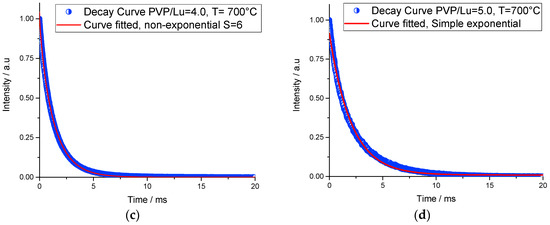 Decay Curves and fiting for 5D0 → 7F2 (612 nm) for PVP/Lu = X ratio films: (a) X = 1.0; (b) X = 2.5; (c) X = 4.0; and (d) X = 5.0.