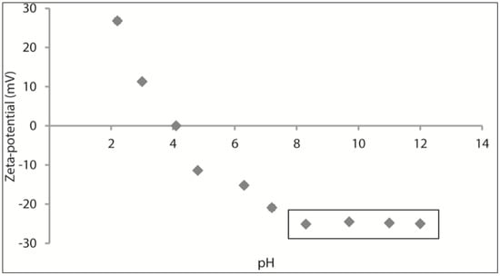 In order to evaluate the pH stability of grass pea flour dissolved in water at a concentration of 1 mg mL−1, a titration as function of pH was carried out to measure Zeta-potential. The charge of particles depends on the solvent used [22]. Zeta-potential is a function of the surface charge of the particle, of adsorbed layer at the interface, and of the nature and composition of the surrounding suspension medium. Generally, Zeta-potential values higher than ±25 mV indicate that the solution is quite stable [22]. The data reported in Figure 1 show a moderate stability of grass pea flour suspension, in fact, the potential changes from +27 to –25 mV by varying the pH from 2 to 12. At pH 4, the suspension became unstable (0.01 ± 0.53 mV) since this pH is close to isoelectric point of grass pea proteins (globulins and albumins), which are in the range of 4–6, as also demonstrated by Romano et al. by performing two-dimensional gel electrophoresis [23]. Also, the dimension of particles was quite stable (data not shown) during the titration, being the main particle size diameter equal to roughly 200 nm of diameter for all the pHs analyzed (data not shown).