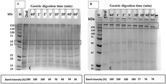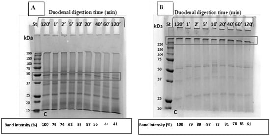 (A) Duodenal in vitro digestion and densitometry analysis of 50 kDa protein bands of grass pea film cast without mTGase; (B) Duodenal in vitro digestion and densitometry analysis of protein bands of >250 kDa) of grass pea film cast in the presence of mTGase (33 U/g). SDS-PAGE 12%. Molecular weight standard, Bio-Rad. C is control sample incubated without chymotrypsin and trypsin. St, Molecular weight standards, Bio-Rad.