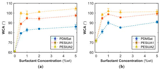 WCA vs. concentration of siloxane comonomer of flat surfaces polymerized without air exposure (a) and after 120 min of air exposure (b).