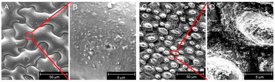 Texturized surfaces were produced in a second step. The leaves of two plants were selected, namely lotus (Nelumbo nucifera) and nasturtium (Tropaeolum majus). The WCA of the lotus and nasturtium leaves, reported in Table 2, were found to be approximately 20° lower than previously reported values of 164° [25] and 162° [26], respectively, due to seasonal factors. The surface of the fresh leaves was used as master and was replicated in the formulations using a UV-nanoimprint lithography process (UVNIL) and an intermediate negative polydimethylsiloxane mold (PDMS, SYLGARD™ 184, Dow, Midland, MI, USA) as detailed in [17]. This soft, vacuum-free and ambient molding technique preserves the delicate biological surfaces from damage and enables to accurately reproduce their nanometer scale features [27,28]. In short, square samples (2 cm × 2 cm) cut from the leaves were fixed onto Petri dishes. PDMS was mixed with hardener (10:1 ratio). The mixture was homogenized manually for 5–10 min and degassed under a reduced pressure of 50.8 kPa for 5 min and 84.7 kPa for 10 min. It was poured onto the samples and subsequently cured at room temperature for 48 h. A UVNIL tool equipped with independent control of UV exposure and pressure was used to print the composite surface with the PDMS mold. A 200 μm thick layer of the liquid formulations was applied on a glass slide using a doctor blade. The PDMS mold was attached to another glass slide and the PDMS surface was put in contact with the liquid formulation under a controlled pressure of 3 bars. Curing was then performed using the same source and same UV dose as for the flat films. The printed surfaces were finally carefully demolded.