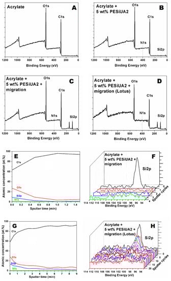 The in-depth distribution of Si in the flat and texturized sample of acrylate with PESiUA2 polymerized after 120 min of exposure to air was further analyzed by depth-profiling using an Ar+ source and is also shown in Figure 3. Assuming an etching rate of 5.5 nm/min for acrylate as previously determined for a BEMA–PEGMA siloxane enriched copolymer [35], we can see that there is an exponential decay of the Si 2p signal in the first 5 nm for the flat sample (Figure 3E), and in the first 10 nm for the texturized sample, beyond which the signal smoothly decreases till 50 nm in depth (Figure 3G). In Figure 3F,H, we have reported the Si 2p high resolution curves acquired during depth profiles for the two samples, to better highlight the signal decrease. Again, the differences in depth profiles may result from the sensitivity of the XPS measurement to surface roughness.