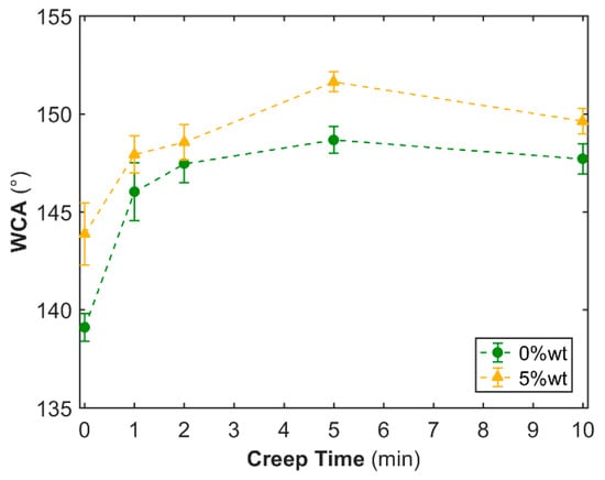 The low-pressure UVNIL process is fundamentally based on the viscoelastic creep flow of the resin into the sub-micron topography of the PDMS template, so that the replication is pressure and time-dependent. In order to allow the resin to better fill the mold cavities, a pressure of 3 bars was applied to the resin in contact with the PDMS mold for periods up to 10 min prior to UV curing. Figure 4 shows the influence of creep on the WCA of synthetic lotus surfaces, based on the acrylate with and without 5 wt % of PESiUA2 (SEM images of these surfaces are shown in Figure S4). In both cases, the WCA increased with creep to a maximum value of 152° (shown in Figure S5) with PESiUA2 after 5 min and then decreased. Nevertheless, the WSA reported in Table 2 was found to remain rather high and equal to 30°.