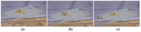 Although the WSA was equal to 30° the synthetic acrylate + PESiUA2 lotus surface possessed effective self-cleaning properties. This was demonstrated by letting 10 μL water droplets fall from a height of 1 cm on the surface partly covered by ground pepper, on a glass support tilted at a 10° angle. A sequence of three images taken from a video are shown in Figure 5, where the capture of pepper grains by one bouncing droplet is evident (the video is available in the Supplementary Materials). Notice that, due to its hydrophobicity, ground pepper was reported to be more challenging to remove than other hydrophilic particles such as MnO and SiC [8]. The drop velocity upon impact was close to 0.4 m/s, which was high enough for the drop to bounce on the surface as observed (Figure 5b and Video S1 in the Supplementary Materials) [36]. The corresponding kinetic energy of the drop was close to 1 µJ, which again was high enough to overcome the effective interfacial energy E close to 0.07 µJ. The latter was roughly estimated as