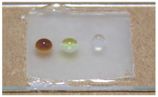The behavior of the synthetic lotus surface based on the acrylate with 5 wt % of PESiUA2 to other liquids than water is shown in Figure 6. The difference of contact angle is evident, confirming the hydrophobic character of the surface.