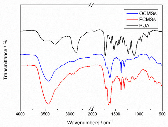 The FTIR spectra of polyurethane acrylates (PUA), organic carbon microspheres (OCMSs) and FCMSs.