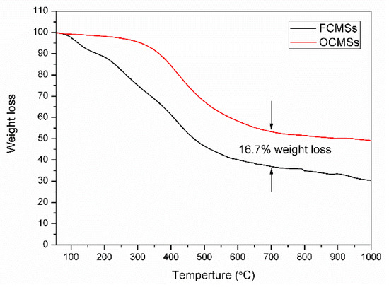 Figure 5 showed the TGA results of FCMSs and OCMSs. The thermal stability of FCMSs was lower than that of OCMSs. The weight loss of OCMSs in the range of 400 to 600 °C was obvious, while that was more obvious for FCMSs in the range of 100 to 400 °C. It also can be seen from the TG diagram that the high grafting rate of the PU structure on the surface of FCMSs was 16.7%.