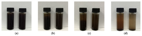 The dispersion of FCMSs and OCMSs in acetone solution: (a) Initial state; (b) 2 h; (c) 4 h; (d) 18 h. The left side of each picture was OCMSs and the right one is FCMSs.