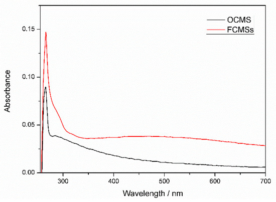 Since the organic modification of OCMSs was carried out in acetone, the same solvent was chosen to investigate the dispersity of carbon microspheres in solution during different time periods. Figure 6a showed the state of FCMSs and OCMSs after ultrasonic dispersion in acetone for 30 min. It could be seen that OCMSs and FCMSs had good dispersity in acetone. In Figure 6b, OCMSs showed obvious stratification after 2 h standing, while FCMSs still had good dispersity. As shown in Figure 6c, the stratification of OCMSs was further aggravated after 4 h of standing, and FCMSs began to appear slightly stratified. As shown in Figure 6d, after 18 h of standing, OCMSs and FCMSs were completely precipitated and the solution was separated into two phases. This indicated that the organic functional groups grafted on the surface of FCMSs had improved their ability to disperse in acetone to a certain extent. To further confirm the dispersity of OCMSs and FCMSs in acetone, the supernatant was analyzed by UV-Vis spectrometer after standing for 18 h (Figure 7). The strong peaks at 265 nm indicated that the absorbance of FCMSs was stronger than that of OCMSs, which suggested that the dispersity of FCMSs in acetone was better than that of OCMSs.