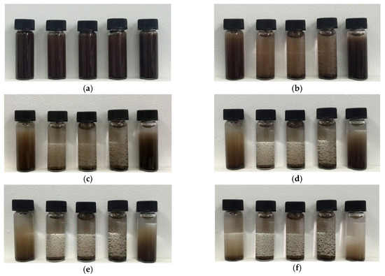 The dispersity of FCMSs in the solutions with different pH. (a) Initial state; (b) 2 h; (c) 5 h; (d) 8 h; (e) 11 h; (f) 24 h. Images in each picture from left to right were the solution with the pH of 2, 6, 7, 8 and 12.
