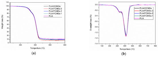 Figure 10 showed the TGA and Differential thermal gravity (DTG) spectra of UV cured films. As can be seen from Figure 10, all samples had two weight loss stages. The comprehensive performance of UV-curable coatings was shown in Table 1. The first and second stage were the thermal decomposition of the soft segments in the PUA molecular chains and hard segments respectively. The first stage of the starting weight loss temperature (T5%) was near 290 °C and the peak temperature of DTG (Tmax1) was near 338 °C, in which the Tmax1 of PUA/FCMSs-1 reached 343 °C. The corresponding temperature when the sample weight loss rate reached 50% (T50%) was near 410 °C, and the peak temperature of DTG at the second stage (Tmax2) was near 417 °C. Compared with pure PUA, composites had better thermal stability as shown in Table 1. It could be seen that the TG curve of the UV-curable coating had good smoothness from Figure 10, which indicated that the UV-curable PUA molecular chains had good flowability and could disperse the heat in time. In addition, the addition of FCMSs or OCMS did not affect the movement of PUA molecular chains, while they were contributed to the dispersion of local heat. The addition of FCMS can increase the cross-linking density, which are also responsible for giving an improved thermal stability. Therefore, adding FCMSs or OCMs can help to improve the thermal performance of PUA. Moreover, compared to PUA, the pencil hardness also increased.