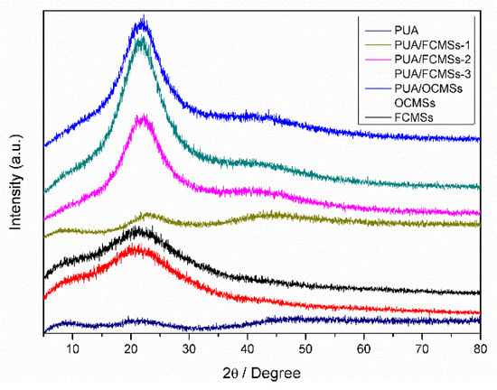The XRD images of UV curing film was shown in Figure 12. Compared with pure PUA, all the PUA composites had a proliferation of diffraction peak near 20°. These peaks were attributed to the short distance arrangement of the amorphous segment of the PUA molecule chains and the uniform three-dimensional network structure formed in the PUA molecule chains. OCMSs and FCMSs also had similar steamed points near 20°, which corresponded to the (002) plane of graphite [9,13]. With the increase of FCMSs content, the peak width and peak height of the diffraction peak of UV-curable films increased gradually. These results showed that there was a strong interaction between FCMSs and matrix resin, and with the increase of FCMSs content, the interaction between them gradually increased. The XRD spectra of PUA/OCMSs and PUA/FCMSs-3 showed that both of they had the same width of peak near 20°, while the height of the former was lower than the latter. This indicated that the interaction between OCMSs and PUA was smaller than that between the FOCMSs and PUA when the filler quality was at the same level. These phenomena further indicated that FOCMSs and PUA molecular chains were connected in the form of chemical bonds.