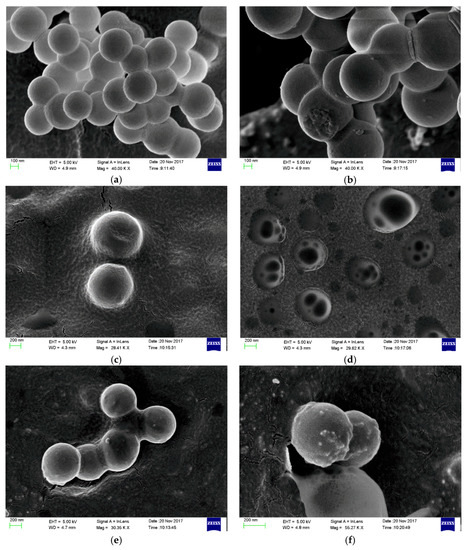 CMSs had a very smooth surface and there were some interconnections between carbon spheres. This may because that the hydrothermal process led to burst nucleation and durative polycondensation of glucose molecules, finally developing irregular and crosslinked carbonaceous clusters [16]. After being oxidized, the surface of OCMSs became relatively rough. There were some fractures between the crosslinked carbonaceous clusters. Figure 13c,d contained the cross-sectional scan of PUA/FCMSs-3 sample. It could be seen from the figure that FCMSs had good dispersity in PUA matrix. The phenomenon of crack termination was clearly observed around FCMSs particles which indicated that the interfacial force between PUA and FCMSs was very strong. Figure 13e,f showed cross-sectional scans of the PUA/OCMSs samples, in which obvious fracture micro-holes could be found and OCMSs had low dispersity in PUA matrix. The micro-holes showed that the interfacial force between PUA and OCMSs was very poor. In composite materials, the difficulty of crack propagation along the interface can have a great influence on the mechanical properties of the material. Potentiation of FCMSs was better than that of OCMSs and this can be explained in the following ways: first, there was organic matter grafted on the surface of FCMSs so that it had a better dispersion in the PUA prepolymer. Second, after the surface of the ball was modified, the carbon-carbon double bond (C=C) was introduced to its surface, and under UV irradiation, the double bonds on the surface and in the PUA prepolymer were condensed together to enhance the interface interaction.