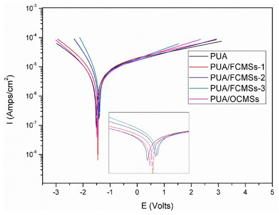 The polarization curves of UV-curable coatings were shown in Figure 16. The electrochemical characteristic parameters of the coatings fitted by Tafel (traditional method) were shown in Table 2. As can be seen from Table 2, with the increase of FCMSs content, the corrosion current (Icorr) and the corrosion rate (Vcorr) of PUA/FCMSs coatings decreased gradually. And those parameters were all lower than those of pure PUA. The natural corrosion potential (E0) of PUA/FCMSs coatings had positive shifts compared with pure PUA. When the content of FCMSs and OCMSs were all 1%, the corrosion current of PUA/FCMSs was lower than that of PUA/OCMSs.