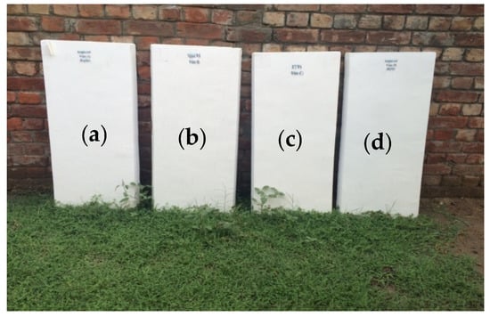 The Temperature (°C) and Humidity (%) were taken as recorded in Pakistan Meteorological Department (Met) Lahore Pakistan for the months May 2016 to April 2017. The maximum and minimum daily temperature readings were taken to measure the daily average temperature. The daily average temperatures were then used to compute the average temperature per day by dividing their sum with the given number of days. Similarly, the average humidity was also measured. These average values of Temperature and Humidity for the respective number of days were computed and recorded against the given dates of the months as mentioned in Table 3. Paint sample prepared was tested for algae growth. Four concrete slabs were coated with developed paint and conventional paints. Composition of conventional Paints A, B or C cannot be discussed because formulation is a confidential information. Ingredients in paint formulations are proprietary and trade secrets. Paint companies in Pakistan do not disclose their compositions. Conventional Paints A, B or C are top three brands of acrylic latex façade paints available in Pakistan market. Newly developed paint, conventional Paints A, B and C were applied on four cementitious slabs independently and placed in outdoor experimental sight of Brighto Paints Private Limited Pakistan, in grass to facilitate algae growth where appropriate sunlight, dirt and humidity are present. Dimensions of each slab is 17 in. (width) × 35 in. (length) × 2.25 in. (width) as shown in Figure 1.