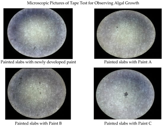 Paint is a semi-solid substance that is applied over a surface in the form of a thin layer []. There are two major functions of paint. One is protection and the other is decoration. It has been observed that fungi and bacteria usually develop on gloss paint films, whereas algae develop on water-based paints []. Algae, fungi, and bacteria are different from each other in terms of morphology and growth patterns. Algae are photosynthetic while others are not. Algae contains chlorophyll while fungi and bacteria both don’t have chlorophyll. Fungi are generally big in size while bacteria are very minute in size. Algae, fungi, and bacteria can be distinguished by microscope. Due to the presence of different photosynthetic pigments, algae are found in different colors like green, red, brown, but mostly green in color. While fungi do not possess any photosynthetic pigment []. Algae are the highly diversified group of microorganisms identified as microalgae. They have been roughly enumerated as about ten million mostly microalgae []. Algal growth is affected by pH value. When pH was lowered from 6.6 to 5.0, algal abundance increased []. Reduced algae growth was observed in a group of pH-tolerant algae when the pH exceeded 9.5 []. The algal growth is strongly influenced by the water supply, including the rain, the condensation, and high humidity []. Environmental factors e.g., humidity, temperature and dirt accumulation are major sources of algae accumulation on façade paints. The growth of microorganisms in paint causes many problems such as degradation of paint films, blistering, flaking and breakdown/cracking of the paint films []. Different allergies that could harm the brain or peripheral nervous system are caused by different cyanobacterial species. The other harmful effects are nerve ion-channel blocking, neuromuscular blockade, anti-acetyl cholinesterase activity, anti-phosphate activity and protein synthesis inhibition []. Symptoms due to cyanobacteria intake include abdominal pain, nausea, vomiting, diarrhea, sore throat, dry cough, headache, blistering of the mouth, atypical pneumonia and elevated liver enzymes in the serum []. The main objective of this paper is to develop algae resistive paint without any algaecide which is very harmful to ecosystems. TBT is a broad-spectrum algaecide []. TBT causes histopathological effects [] and mortality []. TBT pollution can adversely affect whole populations []. Another algaecide is Diuron, which has adverse impacts on human health and environment []. It is a human carcinogen []. Carbendazim algaecide is identified as carcinogenic, mutagenic and teratogenic in experimental animals and the structure of animal cells [,]. Carbamates algaecide hinders cellular metabolism including energy, protein, and nucleic acid metabolism and cause cell regression and death []. Zinc pyrithione (ZnPT) algaecide may reach to stem cells in human skin hair follicles []. Toxicity of zinc pyrithione results in iron starvation []. The most important chemical classes of algaecides used in paints are Tributyltin (TBT), Diuron, Carbendazim, Carbamates, Zinc pyrithione. TBT can induce histopathological effects and mortality [,]. TBT pollution is of serious concern as it has led to collapse of whole populations of organisms []. Diuron is a problematic water pollutant which has major impacts on human health and the environment. The diuron is absorbed from the gastrointestinal and respiratory systems []. The carbendazim is known to be carcinogenic, mutagenic and teratogenic in experimental animals and animal cell cultures [,]. The carbamates inhibit cellular metabolism including energy, protein, and nucleic acid metabolism, thereby, causing cell regression and death []. The zinc pyrithione was found to be highly toxic to aquatic plants and animals [] as it could inhibit cell growth [,].