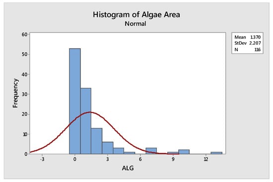 The distribution of response variable (Algae Area %) before commencing the regression analysis from Table 4 and the Histogram given in Figure 3 was found to be positively skewed.
