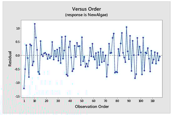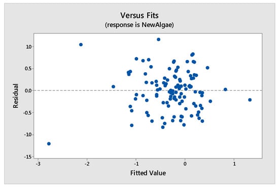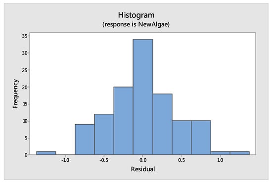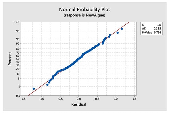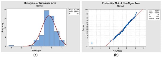 Anderson Darling’s test for Normality showed a p-value less than 0.05. The Logarithmic transformation was used to make the distribution of the response variable Normal. The transformed variable is named as new Algae Area and results of transformed variable is given in Table 5 and Figure 4a,b. Anderson Darling’s test for Normality showed a p-value greater than 0.05 leading to the acceptance of the hypothesis of the data to follow the Normal distribution and from Figure 4a,b.