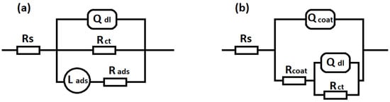 The equivalent electric circuit models presented in Figure 2 were utilized for simulation of the EIS response of the uncoated and coated Mg alloy specimens. For the uncoated AZ31B, the equivalent circuit consists of charge transfer resistance (Rct), double layer capacitance (Qdl), adsorption resistance (Rads) and adsorption inductance (Lads) [45]. The Qdl and Rct are associated with the Faradaic processes that take place at the interface of the solution and the electrode surface and the Lads and Rads can be attributed to the formation of a partially protective surface layer on the Mg alloy. In contrast, the equivalent circuit for the coated specimens (Figure 2b) consists of coating layer resistance (Rcoat) and capacitance (Qcoat) and the charge transfer resistance (Rct) and double layer capacitance (Qdl) [54]. Note that in the equivalent models the constant phase element (CPE) was used to fit the electrochemical system. The impedance (Z) of the CPE is given by: