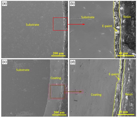 Scanning electron microscopy (SEM) images show the polish-cross section of AZ31B Mg alloy with (a,b) e-painted on AZ31B and (c,d) e-painted on cold spray AA7075.