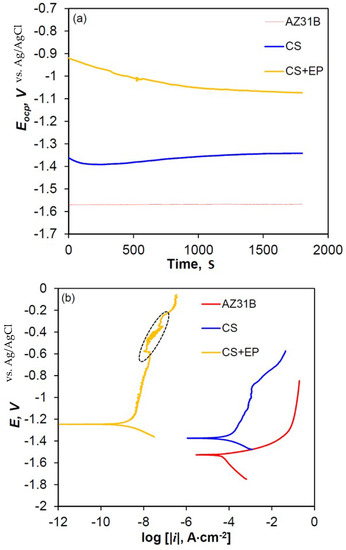 Figure 5a shows the OCP values of uncoated, CS AA7075 coated and CS + EP coated AZ31B specimens immersed in a 3.5% NaCl solution for 30 min. It is clearly seen that the CS + EP coated specimen has significantly nobler OCP values compared to the other two specimens with a steady state potential of −1.07 V, indicating very low thermodynamic tendency of corrosion owing to the protection of the dual-layer coating. The uncoated AZ31B exhibits a constant but the most negative OCP value of −1.58 V over the 30 min, which implies very high corrosion tendency. In contrast, the CS AA7075 alloy showed a slight initial potential drop likely related to the destruction of a virgin aluminum oxide film formed during the cold spray process and then a gradual increase to a steady state at −1.34 V due to the formation of a stable oxide film in the salt solution. A similar OCP behavior of CS pure Al on AZ91D alloy was reported in literature [47,48].