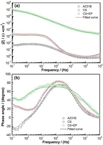 EIS technique is a powerful tool that is commonly used to study the protectiveness of coatings. In this work, the corrosion behavior of uncoated and coated AZ31B Mg alloy specimens was investigated using EIS and the results are presented in Figure 6 in the form of the Bode plot. Prior to the EIS measurement, the specimens were immersed in the 3.5% NaCl solution for 30 min to achieve a stable OCP. The EIS behavior of the specimens at low frequencies can be correlated to the corrosion resistance of the surface associated with the presence of oxide film or hydration [52]. As reported in [53], during immersion the hydrated or oxide film can act as an electric barrier hindering the electric charge transfer through the film. The efficiency of this barrier completely depends on the density and stability of the film. As shown in Figure 6a, the impedance modulus of the CS + EP coated AZ31B Mg alloy is much higher than that of the CS coated and uncoated AZ31B specimens, which indicates that a thick insulating barrier layer was formed on the EP + CS coated specimen, resulting in superior corrosion resistance.