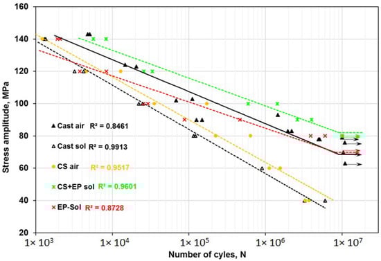 S-N curves show a comparison of fatigue life between the uncoated and coated AZ31B cast alloy tested in 3.5 wt.% NaCl solution. Note: EP-e-paint, Sol–3.5% NaCl solution and CS-cold spray.