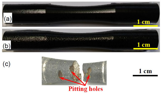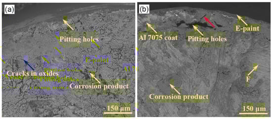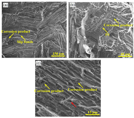 As depicted by Figure 12, corrosion products were visible in multiple locations. In addition, the anticipated typical ductile fracture voids on the fracture zone are visible. The corrosion products were also identified (yellow arrow in Figure 12a) which created micro pits nearby (red arrow in Figure 12c). The stress concentration caused by the pits and plastic deformation resulted in the growth of the pit to create a crack. The crack tips are eventually susceptible to corrosion resistance and formation of oxides. The plastic zone and high stresses at the tip of the crack fractured the oxide and protective layer, which in turn permitted the fresh metal to be exposed to the NaCl solution [60]. However, the chemical reaction at the interface of the substrate coating created local holes, which caused premature failure (Figure 11b). Thus, the combined action of corrosion and induced stress enhanced the progression of corrosion, which led to fracture at low stress amplitudes and deprived the fatigue performance of CS specimens in the corrosive environment.