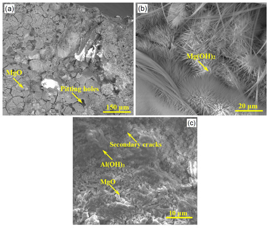 SEM images show the morphology of the corrosion products along with secondary cracks on fatigue fracture surface of the specimens tested at a stress amplitude of 90 MPa in the 3.5% NaCl solution (a) pitting holes with cracked oxides and (b) spiked fibrous-like Mg(OH)2, observed in EP specimens and (c) secondary cracks with porous MgO and dense Al(OH)3, identified in CS + EP specimens.