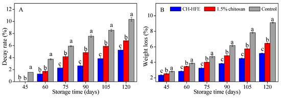 Decay rate is a distinctly important indicator that affects the preservation effect of horticultural produces. As shown in Figure 2A, CH-HFE and 1.5% chitosan coatings delayed the appearance of fungal infection in comparison to uncoated group, which started to decay from 60 days of storage. Many of the uncoated orange fruits (10.4%) were rotten at the termination of storage, while fruits treated by CH-HFE and 1.5% chitosan coating exhibited significantly lower decay rate than the control group at the level of p < 0.05 (5.2% and 6.8%, respectively). As the data in Figure 2B show, for the whole time of experiment, the percentage of weight loss in control group was higher than in both coating treatments, with high weight loss (9.12%) of uncoated orange fruits at the end of storage. However, orange fruits treated with CH-HFE coating displayed the lowest weight loss at 5.16%, which was much lower than that of 1.5% chitosan and control fruits throughout the 120-day storage period.