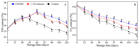 TSS, TA, total sugar, and VC were the key determinants of citrus fruit quality. Figure 3 showed that the content of TSS, TA, total sugar, and VC varied within coated and uncoated groups as storage progressed. As illustrated in Figure 3A,C, the content of TSS and total sugar increased continuously during the early stage of storage, and decreased slightly in the subsequent storage period. The content of TSS and total sugar in the control group reached the highest level at 30 days, while the content of TSS and total sugar in coating groups reached their peaks at 60 days, and were delayed for 30 days more than the control group. During the late 60 days of storage stage, the content of TSS and total sugar in coated fruits was significantly higher (p < 0.05) than the control group. The TA content of all samples fell greatly after 120 days of storage (Figure 3B), and the value was significantly higher (p < 0.05) in CH-HFE-coated treated fruit, compared to 1.5% chitosan coating and the control group. During the storage, the control group showed a greater TA loss. The low level of TA in the control group, relative to coating treatments, suggested that the coating delayed ripening by providing a semi-permeable film around the fruits. The CH-HFE and 1.5% chitosan-coated fruits showed a slight increase in VC content during the first 30 days, reached their peak concentration (56.87 mg/100 g and 54.04 mg/100 g), followed by a decline in the subsequent storage period, while the control group presented a gradual decrease in VC content during the whole storage (Figure 3D). Under the storage conditions, the VC content in CH-HFE coated fruits was significantly higher (p < 0.05) than 1.5% chitosan-coated and control group fruits.