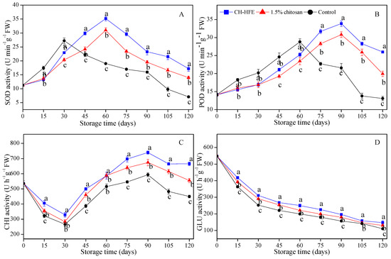 SOD, POD, CHI, and GLU were the main protective enzymes to alleviate lipid peroxidation and delay fruit senescence. Figure 5 showed the activities of SOD, POD, CHI, and GLU varied within coated and uncoated groups, as storage progressed. As illustrated in Figure 5A,B, the activities of SOD and POD gradually increased to reach their peak, and then dropped quickly for the following day. The activities of SOD and POD in the control group reached peak values at 30 days and 60 days, while peak values of SOD and POD activities in coating groups were significantly higher (p < 0.05) than the control group, and delayed for 30 days. Moreover, SOD and POD activities in the CH-HFE coated fruits was significantly higher (p < 0.05) than those with 1.5% chitosan coating and the control group, during the later stage of storage. The CHI activity decreased slightly during the first 30 days, and then increased notably at the end of storage period (Figure 5C). The coated fruits had a relatively high CHI activity, and the average activity of CHI of the CH-HFE and 1.5% chitosan-coated treatment increased to approximately 1.30 and 1.19 times higher than that in the control group. The GLU activity of all samples fell greatly after 120 days of storage (Figure 5D), and the value was significantly higher (p < 0.05) in CH-HFE-coated treated fruit compared to 1.5% chitosan coating and the control group.