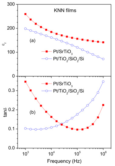 Room-temperature relative dielectric permittivity εr and dissipation factor tan δ of ~335-nm-thick KNN films, deposited on Pt/TiO2/SiO2/Si and Pt/SrTiO3 substrates, are plotted as a function of frequency in Figure 1a,b, respectively.